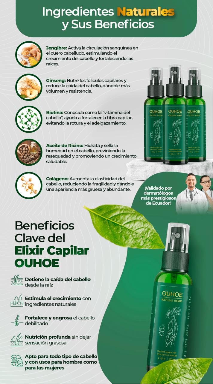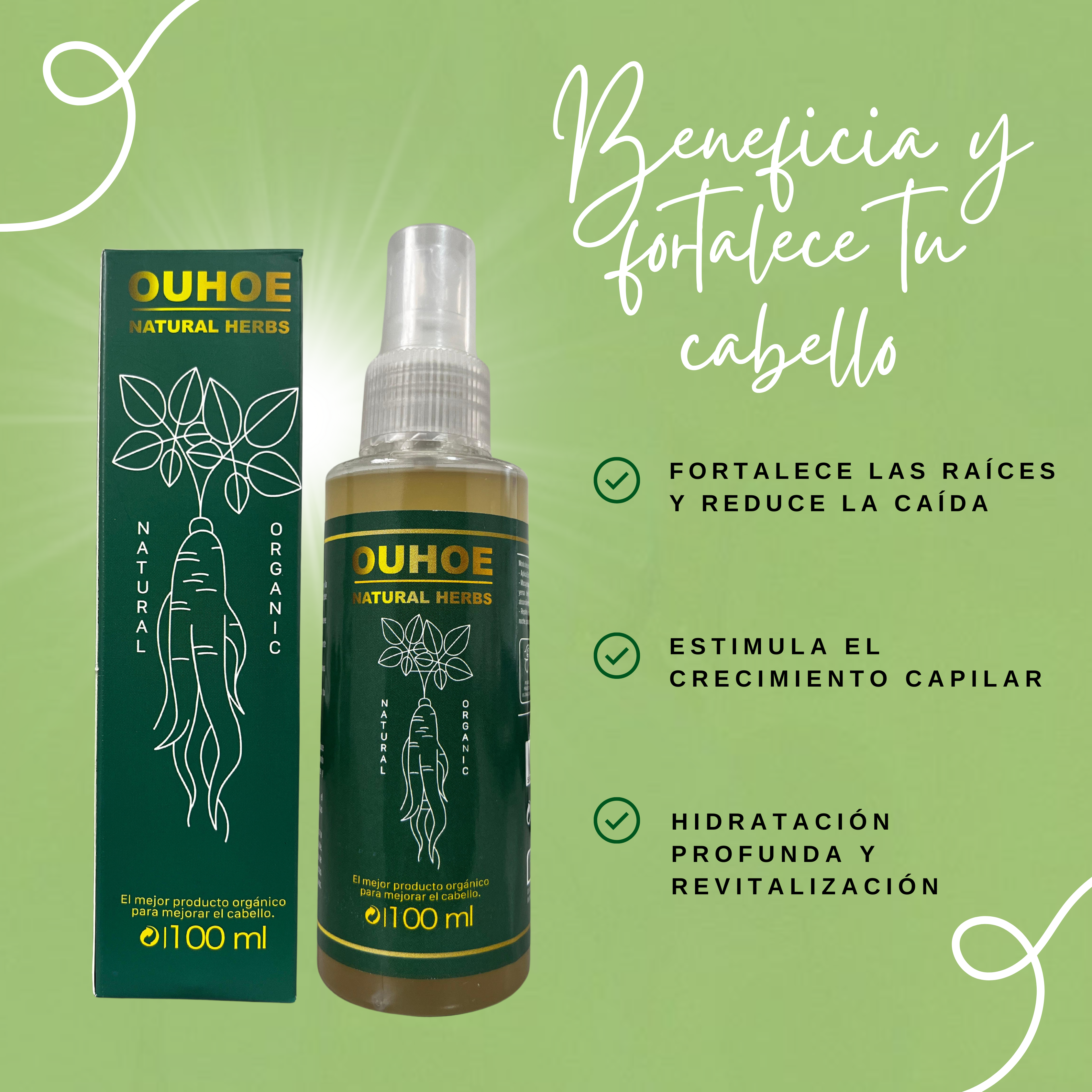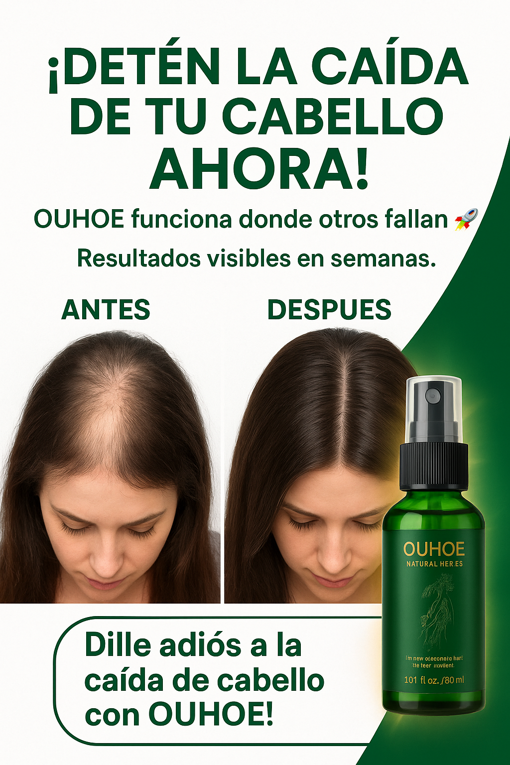 OUHOE Tónico para el Crecimiento Capilar actúa estimulando los folículos pilosos y promoviendo una circulación sanguínea más saludable en el cuero cabelludo.