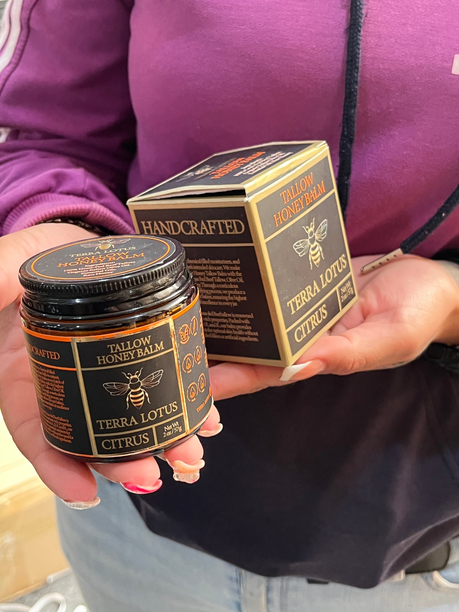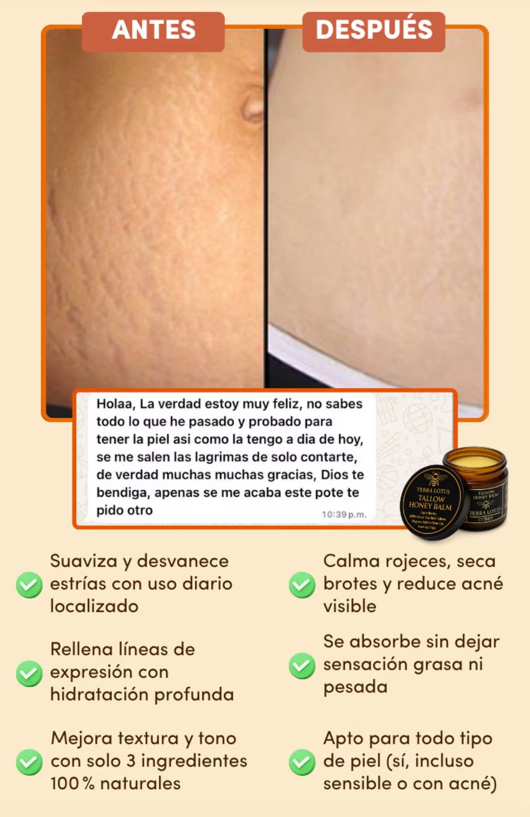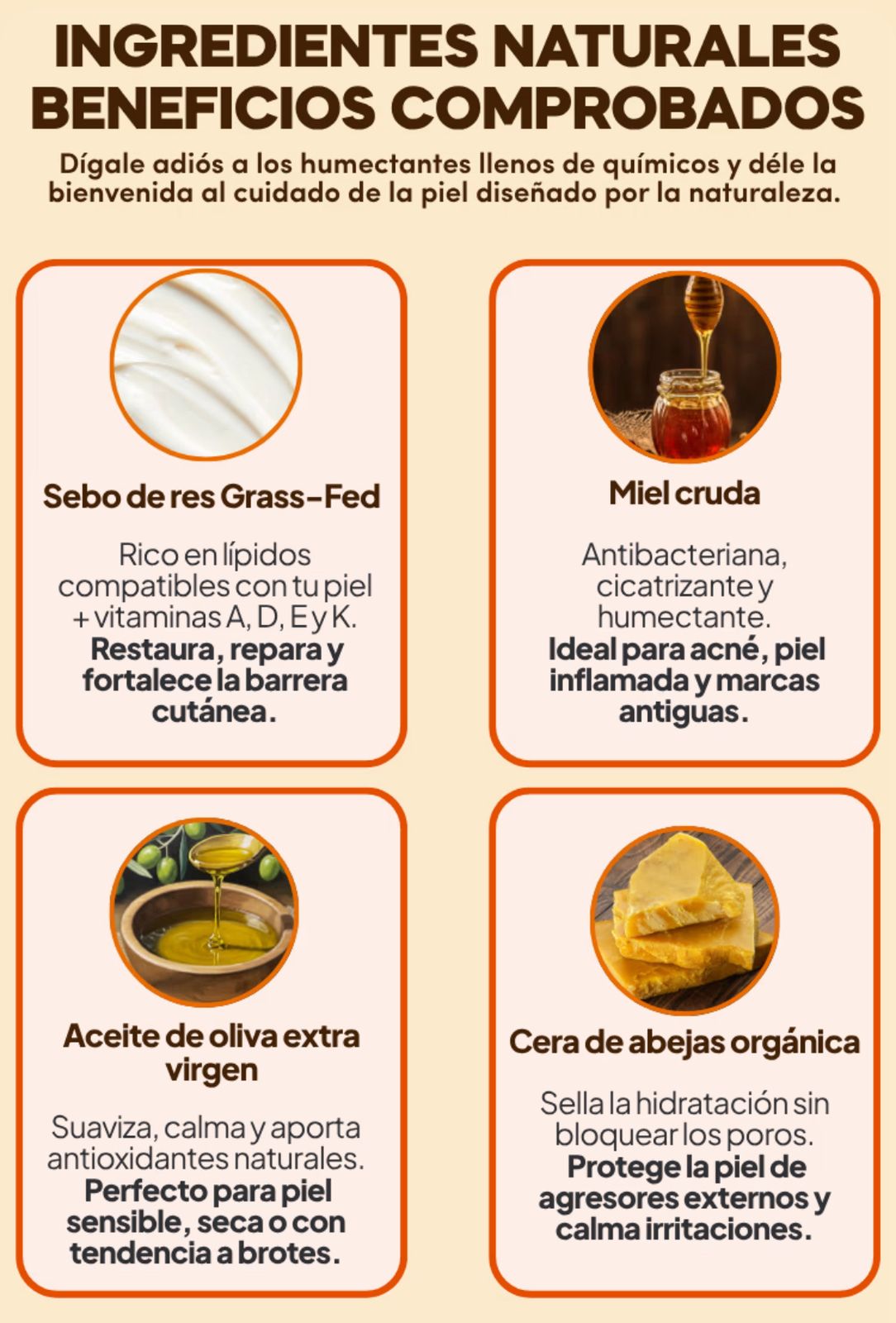 sebo de res grass-fed, miel cruda, cera de abejas orgánica y aceite de oliva. Nada mas
